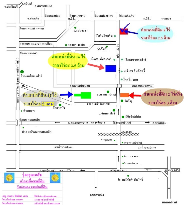 ขายที่ดิน 8 ไร่ หน้ากว้างติดถนนใหญ่ขนาด 4 ช่องทางจราจร ประมาณ 70 เมตร ถนนสายนี้ชื่อถนน บ้านโพธิ์-แปลงยาว หรือถนนหลวงหมายเลข 3304 ระยะทางจากถนนหน้าที่ดินเชื่อมต่อเข้าสู่ถนน 331 (กบินทร์บุรี-สัตหีบ) เพียงไม่ถึง 1 กิโลเมตร