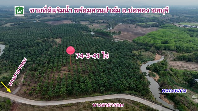 ขายที่ดินติดน้ำ อำเภอบ่อทอง ชลบุรี 74-3-41 ไร่ ขายที่ดินพร้อมสวนปาล์ม บ่อทอง ชลบุรี ขายที่ดินริมน้ำ บ่อทอง ชลบุรี มีน้ำใช้เพื่อการเกษตรตลอดปี ราคาไร่ละ 750,000บาท ปาล์มอายุ10ปีเก็บผลิตได้ ขายที่ดินติดน้ำบ่อทองชลบุรี