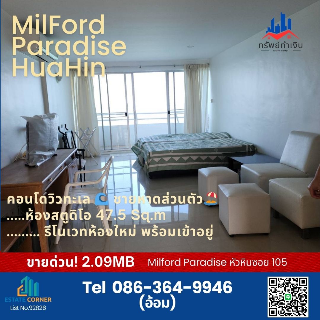 ขาย คอนโด โครงการ Milford Paradise หัวหิน คอนโดติดหาดส่วนตัว วิวทะเลเต็มตา ห้องสตูดิโอ 47.5 ตรม. รีโนเวทใหม่ทั้งห้อง 2,300,000 บาท