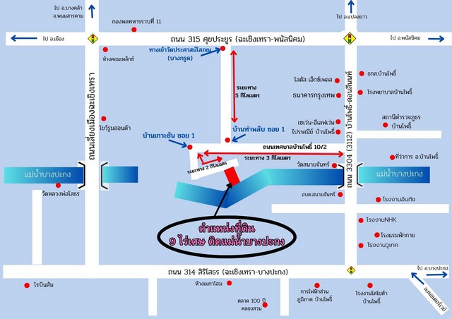 ขายที่ดินติดแม่น้ำบางปะกง เนื้อที่ 9 ไร่ 1 งาน 19 ตรว. มีหน้ากว้างติดถนนซอยสาธารณะ ประมาณ 48 เมตร และมีส่วนที่ติดแม่น้ำ 30 เมตร