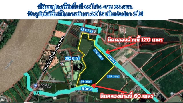 ขายที่ดิน 28 ไร่ 3 งาน สภาพที่ดินส่วนใหญ่เป็นทุ่งนา มีส่วนที่เป็นบ่อปลา ประมาณ 5 ไร่ ที่ดินมีรูปร่างหลายเหลี่ยม หน้ากว้างติดถนนสาธารณะ ประมาณ 43 เมตร