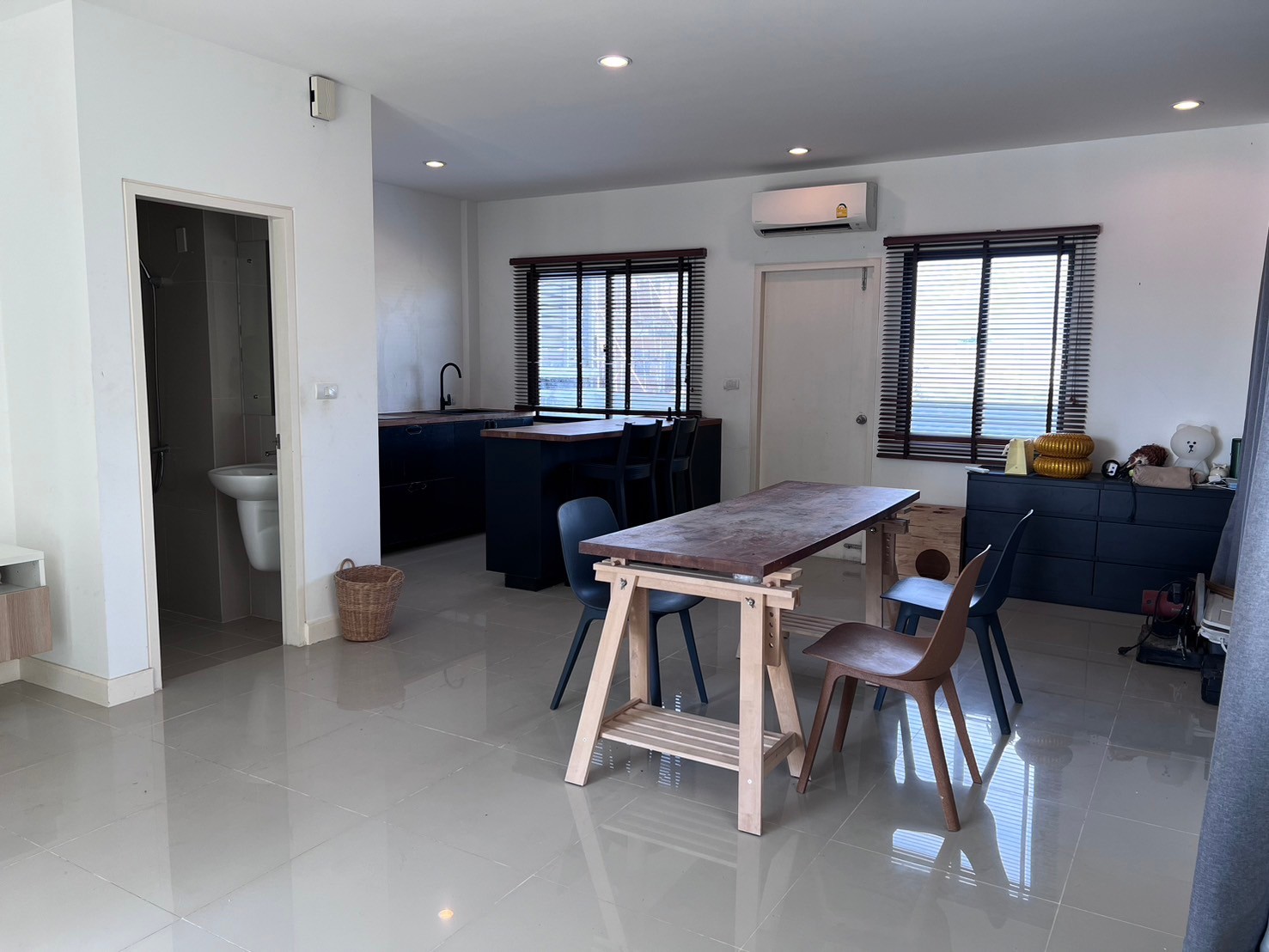 - 3 ห้องนอน 2 ห้องน้ำ 1 ห้องโถง 1 จอดรถ พื้นชั้นล่างเป็นกระเบี้อง 60*60 cm ชั้นบน กระเบื้องยาง บันไดไม้จริง