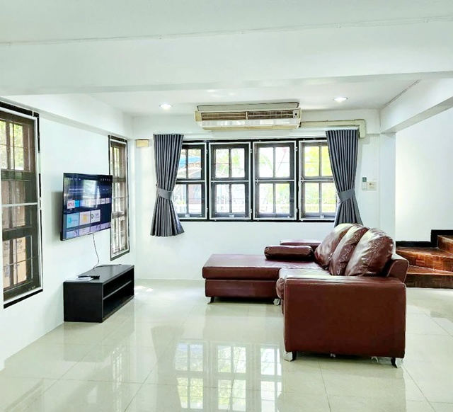 Corner house for rent in a prime location, Ramkhamhaeng 110-112, near MRT Sammakorn (200 meters). The house is a spacious 2-story unit with full furnishings, featuring 2-3 bedrooms and 3 bathrooms. Ready to move in. 26,999 THB/month. (Near Ban Ma intersection, 2.3 km from Ramkhamhaeng Road)